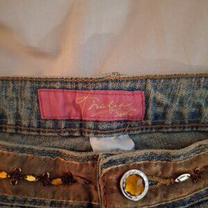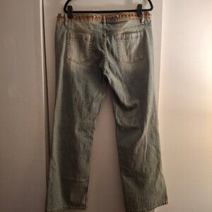 Thalia Sodi women's jeans, featuring a striking light wash hue and a flattering flare and wide leg design with beaded detail at the waist. Size 15/16. waist side to side measures 19 inches. Length 41 inches. Inseam 31 inches. Flare at bottom 10 inches across.