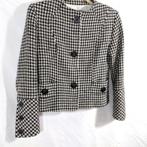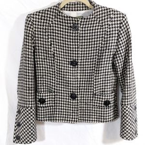 Thalian, Made in Turkey, houndstooth blazer jacket. 100% Murano wool houndstooth in black and cream, clean cut no collar, small shoulder pads, fitted waist, three large black buttons down the front, two lined pockets at the front are accented by the large black buttons. Long sleeves end in a large three accent button cuff.