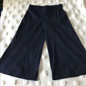 Thalian, Size 6 navy cropped wide leg trousers, nice piping details, 30” waist, 31” long, 9.5 rise, 38” hips, side zipper closure, polyester, rayon, Lycra, nice slightly stretch material. Comfy, BOHO, casual or dressy. Stock pics show a similar but not exact style as my item.