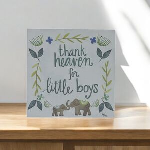 4" x 4", it is a great addition to any home especially a nursery. The sign features the heartfelt sentiment "thank heaven for little boys." The front of the sign features green and blue leaves and floral pattern and a mom and baby elephants. The border of the sign is decorated with blue and white polka dots. The sign features a cute and playful design that will appeal to both kids and adults alike, making it a great gift for baby showers and christenings. The sign is perfect for those who love Christian and baby themes and features decorative elements that will add a touch of charm to any space.