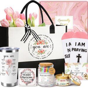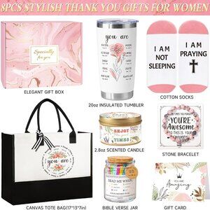 Includes: A thoughtful collection of 8 faith-inspired items, like a scripture jar, tumbler, candle, bracelet, printed socks, gift card, and elegant box — all curated to nourish her spirit.