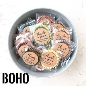 Hi! These items are a huge hit with our customers! We include them with every purchase, and even have a bowl of filled with coils for purchase. We have thousands of individually wrapped hair coils with sweet notes including "Thank you for your order" & "Thank you for supporting my small business".