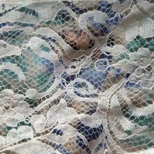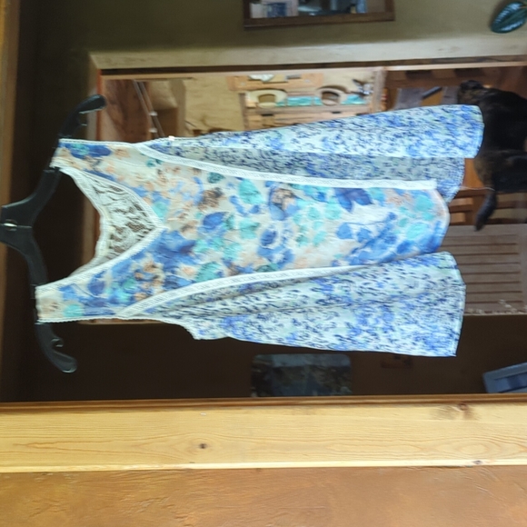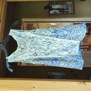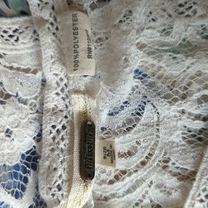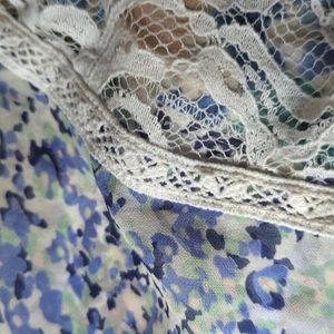 summer tank top by Miss Me Shear light weight flowy tank/camisole. light blue/dark blue/light green/and white print top with a white lace panel down the back.Fun top when layered with a pretty bra underneath