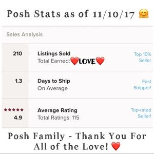 I just want to say thank you to all of the Poshers who have shown and given: love, likes, and shares...and because of you wonderful souls, this has led to purchases, and fabulous ratings from amazing people. But most of all - I hope this has also led to happy Posh customers! You are all wonderful and remarkable people! βΊ Thank you for everything, and I will continue to try my hardest to return the favor you guys have done for me! π€β€π