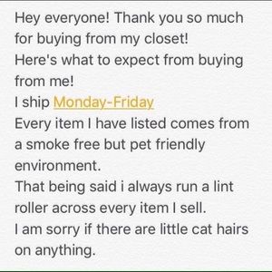 I forgot to mention that if there is anything wrong with an item, maybe something that I missed when listing it, or you are just not in love with what you have purchased. Please let me know either in these comments or the original listing comments. And I will give you 20% off your next purchase. There will be some exclusions because I do sell items for other people! 💖 I want everyone to have a great experience when shopping in my closet!