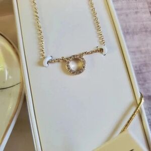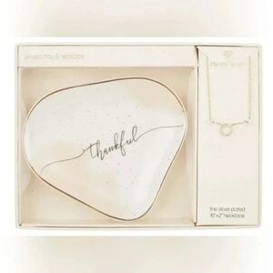 This Inspired By You 2-Pc. Charm Necklace & Trinket Tray Set features a pave open circle chain necklace, and a ceramic trinket tray with the text Thankful. Display box included with cord bow and gift tag.