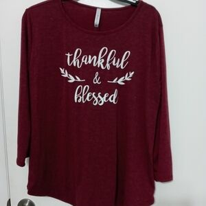 Thankful & Blessed Maroon Colored 3/4 Sleeve Lightweight Rounded Hem Pullover Stretchy T Shirt 96% Polyester 4% Spandex Size Large Brand new With Tag