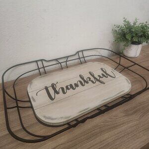 * It features a Thankful sentiment on the wooden surface within the metal frame