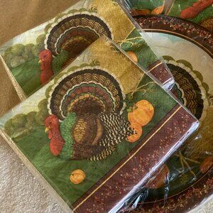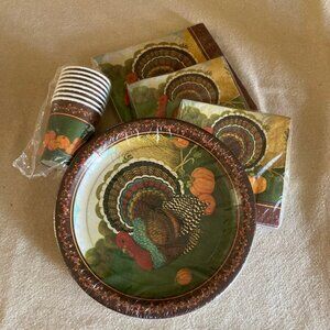 All matching serving pieces decorated with a turkey, pumpkins and a fall leaf border.