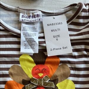 NWT. Charming brown and white striped dress. Features a colorful turkey design with orange and yellow accents. Includes a matching scrunchie hair tie.