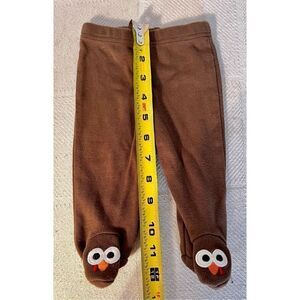 Elastic waistband pants with slipper feet with Turkey Faces. The Back bottom of the pant reads “Gobble”.