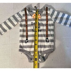 Long Sleeved, Snap bottom Gray Stripe Top With “Daddy’s Little Turkey” Across Front Chest With Attached Bow tie and Printed Suspenders.
