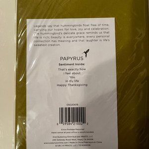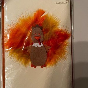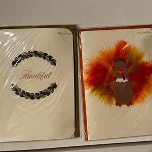 This listing is for two Thanksgiving greeting cards by Papyrus, as pictured. One features the word "thankful" with elegant detailing that resembles embroidery. The second card includes a design with layered feathers for a festive and textured look.