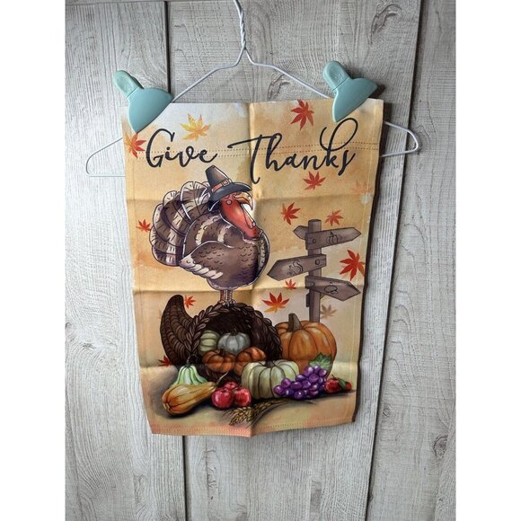 Thanksgiving Rustic Double Sided Garden Flag "Give Thanks" Turkey Cornucopia