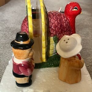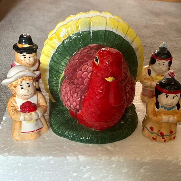 Get festive and delight your family during the holidays. Cute 5-piece, Thanksgiving table set. Like new. Includes turkey napkin holder, and Pilgrim and Indian salt and pepper shakers. The Pilgrims are missing their little plugs.