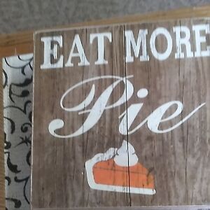Set of three Thanksgiving themed decorative signs. Features phrases like 'I'm Thankful for You' and 'Eat More Pie'. Perfect for holiday decor. The Talk Turkey Sign is re edible, the other side features a Farmers Market sign.