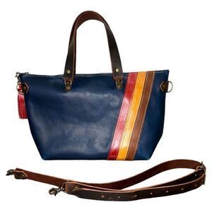 This gorgeous full grain leather bag includes two shorter grab handles with a 6 in drop, and a longer, detachable crossbody strap that ranges from 36-45 inches. It also includes a removable tassel zipper pull!