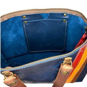 The leather handbag is unlined inside, with a leather phone/keys pocket that measures 6 in x 6.