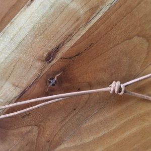 U-bead and gold circle bead. Adjustable ties. This necklace features an adjustable cord so that it can be worn at a variety of lengths. At its longest it is 34 inches and drops 10 inches from the neck. At its shortest it measures 22 inches. I prefer to wear it at 28 inches, dropping 8 inches below the neck just under the bust. Not Madewell, listed as such for views.