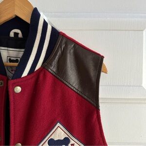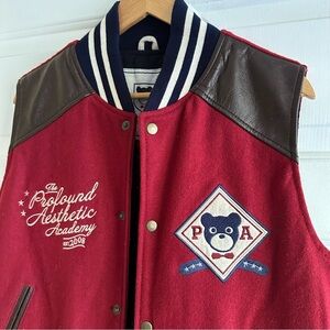 The Academy Varsity Vest in Red features a black wool body with genuine leather vintage distressed upper. There is detailed embroidery throughout and features custom chenille patchwork which includes the signature Profound Aesthetic Bear, the vest is finished with a cotton ribbed waist and neckband featuring a quilted cotton inside. A retelling of the classic letterman style vest, The Academy Varsity Vest is inspired by nostalgic letterman days with a fresh street-wear twist.