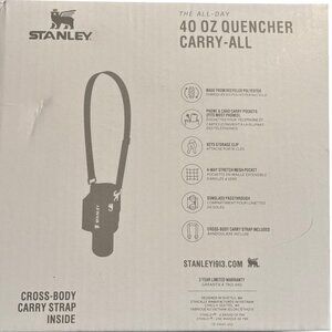 The All-Day 40 OZ Quencher Carry-All in black by Stanley is a versatile tumbler accessory suitable for both hot and cold beverages. Made from 100% recycled polyester, this tumbler features a solid color design and is perfect for individuals on-the-go. The Quencher Carry-All is a convenient and stylish option for those looking for a durable and functional drinkware solution.