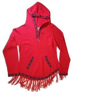 The Alpaca Connection Red Handmade Peruvian Alpaca Knit Sweater Hoodie Size S. Great condition. This beautiful alpaca sweater has a fringed bottom, black trim and beads on the hoodie ties. There is a kangaroo pocket on the front. Retails for $239.