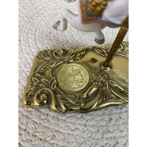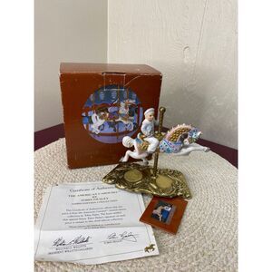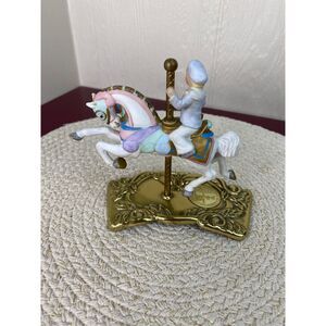 This is a ceramic young boy on carousel horse figure. It has a brass base with the authenticity coin embedded in it. Along with it comes the original tag and the certificate of authenticity and the original box. It was priced originally at $37.95. Very good condition. There is some pitting on the coin. Please see pictures. Box has lots of wear.