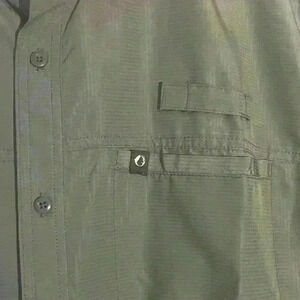 The American Outdoorsman Vented Fishing Shirt is a green, short-sleeved button-up shirt made of breathable polyester material. It has a regular fit and is available in size XXL. The shirt features a fish-themed design and has accents of buttons. It also has pockets for convenience. Ideal for fishing, this shirt is perfect for outdoor activities.