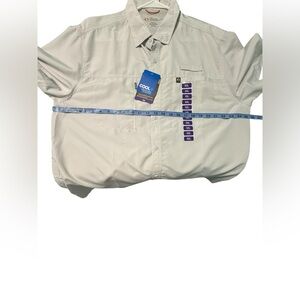 Fog Grey button down shirt. Provides sun protection, wicking & quick dry and cooling technology. Has zipper pocket, open pocket & Velcro strap on chest.