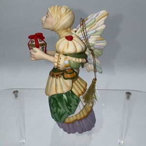 The figurine depicts an angel holding a small, wrapped gift, symbolizing messages of peace and good nature.