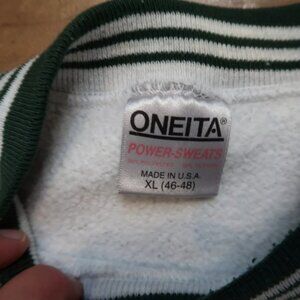 Oneita grey XL sweatshirt with an embroidered Vampire Leprechaun with reindeer antlers holding a cheeseburger. Also says "The Antlers"