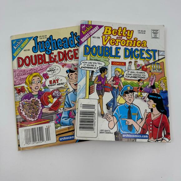 The Archie Digest Library Comic Books No.92 (Jughead's Double Digest) and No.109 (Betty & Veronica Double Digest). These collections feature classic stories and adventures of beloved characters from the Archie universe, showcasing their humor, friendships, and everyday antics. Perfect for fans of all ages.
