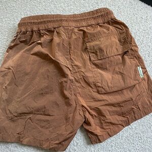 Iconic brand that is no longer producing clothing. These shorts are unisex and so interesting. Only flaw is that one of the cord ends is missing on one side of the drawstring. Can be replaced easily.