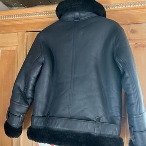 The Arrivals Moya shearing aviator style jacket. XXS. Navy blue leather with black shearling. See photo for wear on sleeve and ends of belts. Overall great condition. Fits oversized (I’m a SMALL and this fits me well- not oversized)