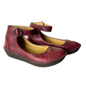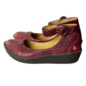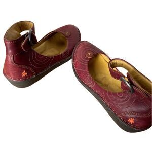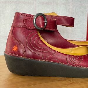 The Art Company red leather shoes with platform sole, that gives a little height to the shoe. Stitched designs throughout the shoes with orange star accents & buttons on the front. Adjustable strap around the ankle. Made in Spain. There is some wear on the soles as well as some wear on the leather, which is shown in photos. These beautiful shoes are so unique, and in overall great preloved condition! The size on the shoe says 6/10/36🎼