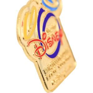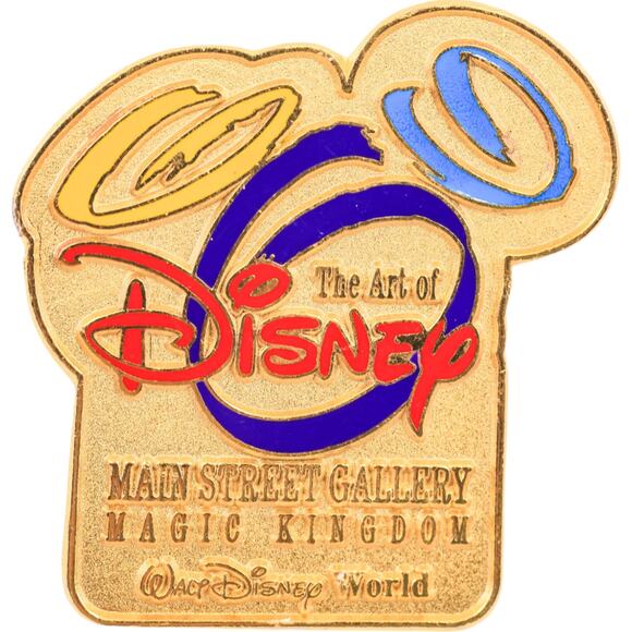 This is a gold pin with "The Art of Disney" logo from the Main Street Gallery in the Magic Kingdom at WDW. This pin was first released in September 1998 on the first Anniversary of the new Disney Gallery on Main Street in the WDW Magic Kingdom. The pins were always in short supply, with less than half the quantity released the first day. 300 pins were found in a back room in February 2000. Mickey head swirl.