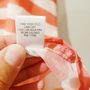 The Arte by Zenana striped sheer flowy tank top. Length goes up to about mid thigh depending on height (I'm 5'1). Loose and flowy. Has a small defect of color but not noticeable as seen in last photo. White and reddish orange stripes. Size Medium. Clean non-smoker home.