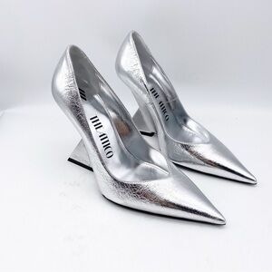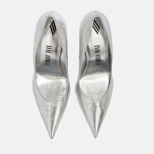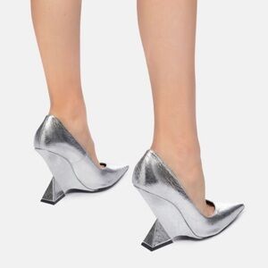 Cheope'' pump in silver laminated craquelé leather with pyramidal wedge, heel height 105mm. Made in Italy.
