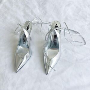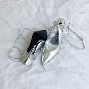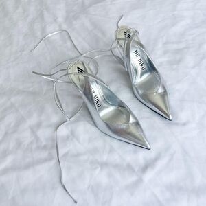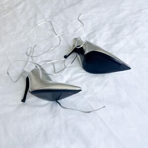 ''Venus'' lace-up slingback in silver laminated nappa, heel height 105 mm