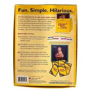 This is a complete game for 4 or more players, suitable for both boys and girls aged 12 and above. The Awkward Family Photos Movie Line Caption Game features movie line captions that players use to caption awkward family photos. It was manufactured in the United States in 2018 and is ideal for family game night. The game title is self-explanatory and the aspects include the game type, year, age level, country of manufacture, number of players, and type. It falls under contemporary manufacture, board and traditional games, games, and toys and hobbies categories.
