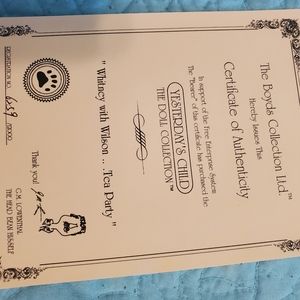 BOYD'S Collection Yesterday's Child WHITNEY WITH WILSON TEA PARTY. 6259/12000 . Limited Edition CERTIFICATE OF AUTHENTICITY 19in. Tall beautiful blonde curls. Hat . Dress and petticoat Bear and tea pot and cup and saucer. With tags and authentic papers.
