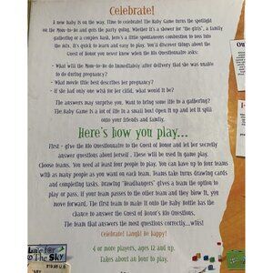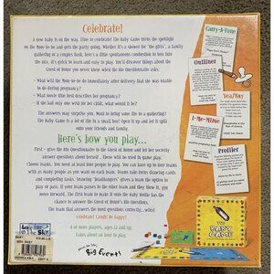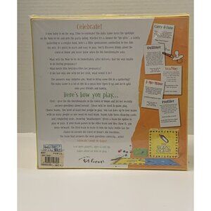 The Baby Game. A party game of bottle warming, diaper changing fun. For expectant parents, couples, familes, parties, baby showers, and more. For ages 12 and up. For 4 or more players. Sealed in original packaging but there are some torn areas and paper left from a sticker.