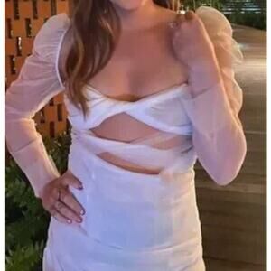 The Bar Jean Dress in Blanc. Size 6. Features sweetheart neckline, sheer long sleeves, puffed shoulders, crystal-embellished adjustable spaghetti straps, twisted bust, front cutout, ruched tulle fabric, hidden side zipper closure, and mini length. Style DR015. Self: 100% Nylon. Lining: 100% Polyester. Excellent condition, no flaws.