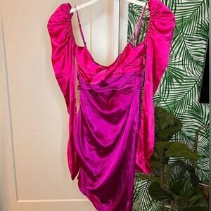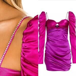 The Bar's signature twist-front minidress is crafted of lustrous silk satin. This two-tone style flaunts a sweetheart neck, adjustable rhinestone-embellished straps, and long puff sleeves filled with tulle.