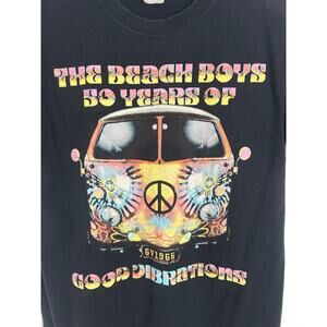 Rock on with this awesome The Beach Boys 50 Years of Good Vibrations concert t-shirt! This black Gildan tee features a cool VW Bus graphic, perfect for any fan.