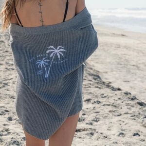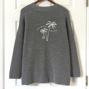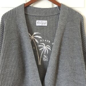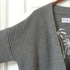 This cute cardigan sweater features an open front, open pockets on the hips, and long sleeves. It has a chunky ribbed knit that is gray in color with a white embroidery on the upper back of two palm trees, the brand's name and when they were established. It is thick, warm, and comfortable. It has a relaxed, loose fit. Perfect for breezy Fall days and evenings at the beach or walking the shore at sunset! Classic, simple, versatile and high quality!