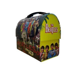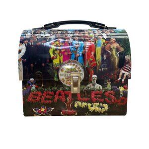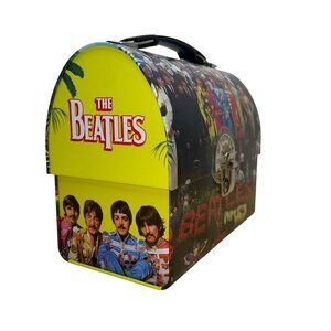 Decorative tin lunch box featuring The Beatles’ Sgt. Pepper's design. Metal latch closure with handle. Dated 2008, officially licensed by Apple Corps Ltd, and made in China.
