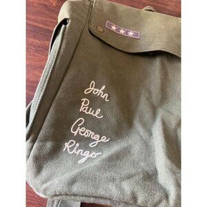 Authentic The Beatles by Junk Food canvas backpack featuring “Sgt. Pepper’s” side flap and embroidered “John, Paul, George, Ringo” on front. Vintage-inspired army green design with printed Beatles portraits and logo patch on the pocket. Adjustable canvas straps, drawstring closure, and metal snap details. High-quality licensed piece — rare and collectible for Beatles fans or retro style lovers.