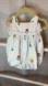Adorable bubble with colorful tulip prints. Features red, yellow, pink, and green accents on a white background. Precious bow with tulips on back. Straps button in back. 3 snaps for diaper access. Precious lace trim. Please note small spot on front that may come out with spot treatment
