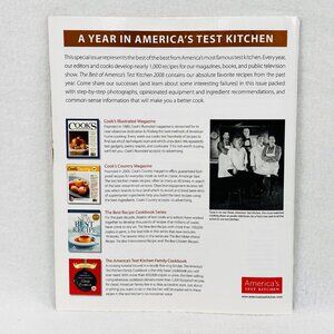 A comprehensive collection of the best recipes and reviews from America's Test Kitchen in 2008. Includes foolproof recipes and expert cooking tips. Color photo of every recipe. Lots of notes and/or tips on each page. Magazine style format. Two random photos of inside recipes shown in photos above. All types of recipes included from appetizers to desserts. Very good overall condition.